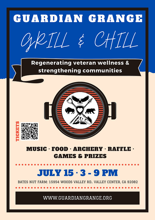 Join Guardian Grange & Special Operations Veterans at Bate's Nut Farm for our Grill & Chill Fundraiser with music, food, archery, raffle, games & prizes all supporting the Guardian Grange mission to help veterans repurpose their skillsets through regenerative agriculture and strengthening local communities!